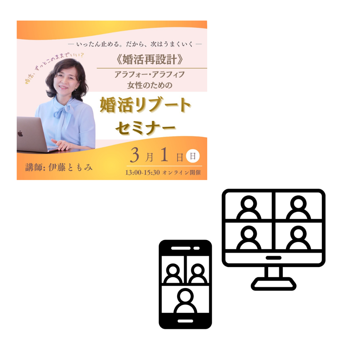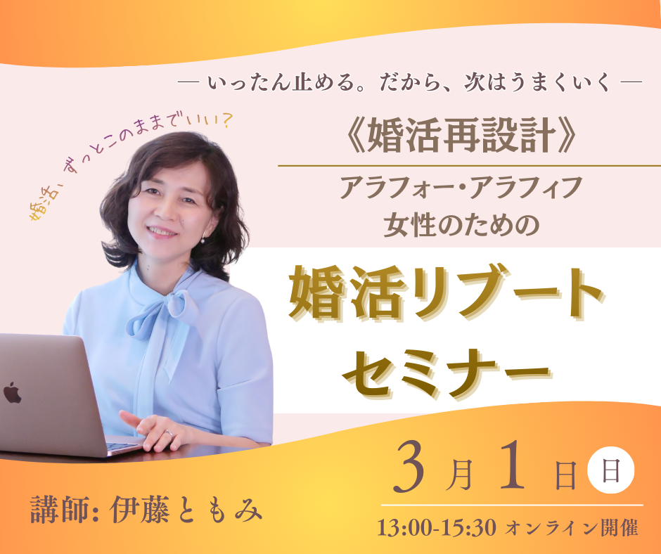 2026年3月1日(日)13:00〜15:30 13:00〜15:30 婚活リブートセミナー 16:00〜17:30 グループコンサル(ご希望者のみ) 募集中 開催場所:会議室ZOOM ※可能な限りカメラオンでご参加ください ※ZOOM URLはお申込みの方にお伝えします ※こちらは女性限定のセミナーです |